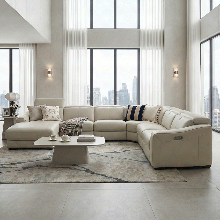 소파가 군더더기 없이 깔끔합니다 5인가족이 편리하게 사용하고 있고 리클라이너도 사용감이 부드럽고 범위도 조절하기편합니다 색상도 부드러운 크림색이라서 집안 분위기가 따뜻해진 느낌이 듭니다