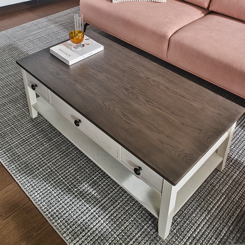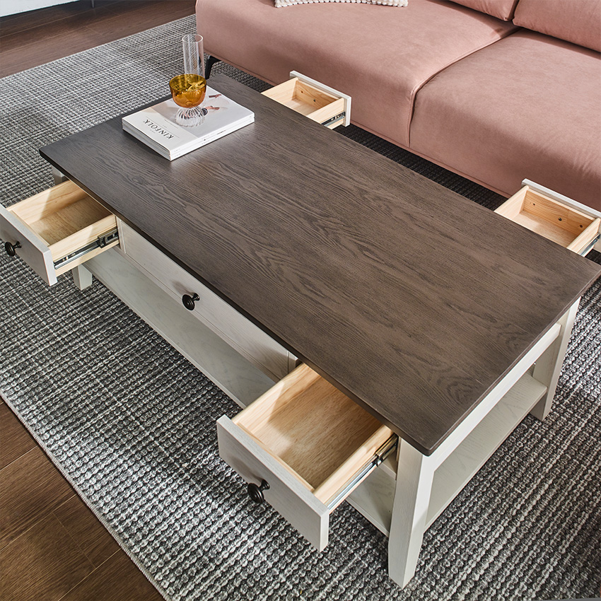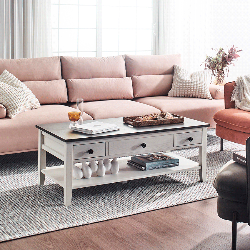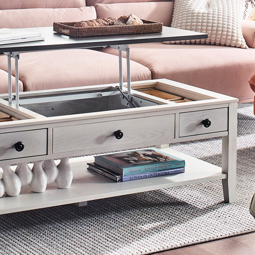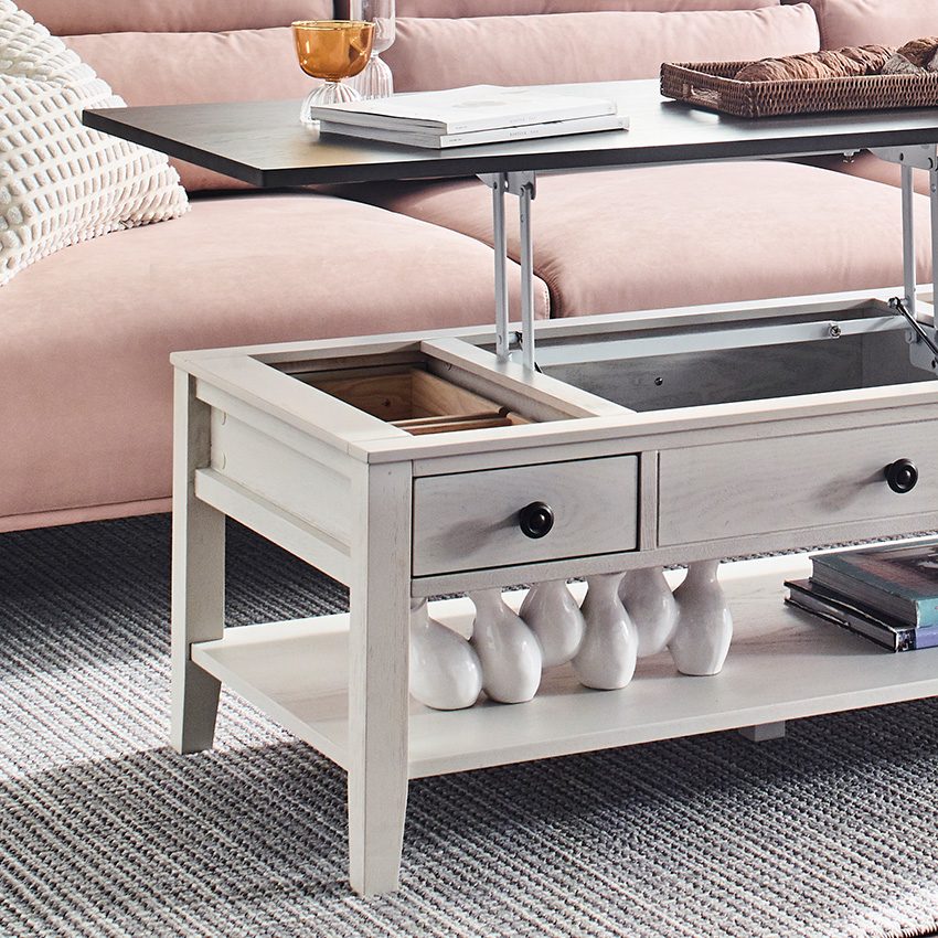 드디어 마음에 쏙 드는 거실 테이블을 찾았어요! Parsons-43/Lift-Top Cocktail Table입니다. 흰색과 고급스러운 상판의 짙은 우드 톤이 굉장히 예쁘고 잘 어울려요.덕분에 거실 분위기가 훨씬 차분하고 아늑해졌습니다. 혼자서는 들 수 없을만큼 무게감이 있고 흔들리거나 움직이지 않아 안정감이 넘칩니다 ​가장 만족스러운 건 역시 리프트업 기능이에요. 소파에 앉아서 노트북 작업을 하거나 간단하게 식사할 때 높이가 딱 맞아 허리가 정말 편해요. 상판을 올리고 내릴 때도 삐걱거림 없이 부드럽고 안정적으로 작동합니다. 내부 수납공간도 넉넉해서 리모컨이나 잡동사니들을 깔끔하게 숨길 수 있어 '미니멀 거실' 완성입니다!
